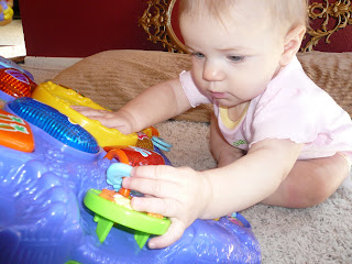 It was a bright day so mommy made sure Alison was protected with suncreen, a hat, a her sunglasses.